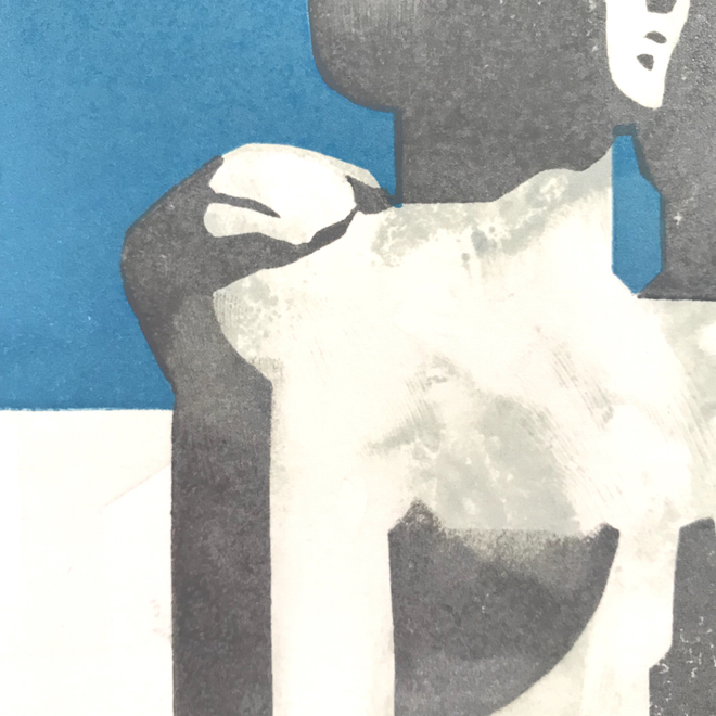 I have a couple of snaps taken during the printing stages, I wanted to create that slightly textured feel for the Henry Moore sculpture so I rolled ink in a painterly fashion directly into the figures section of lino & used my fingers & tissue to wipe away areas - basically using a mono print technique to create that stone effect.Then the other colours were printed quite flat one by one - then towards the end I skimmed the edges of the figure lino plate with a small roller to create a textured weathered outline in some parts.